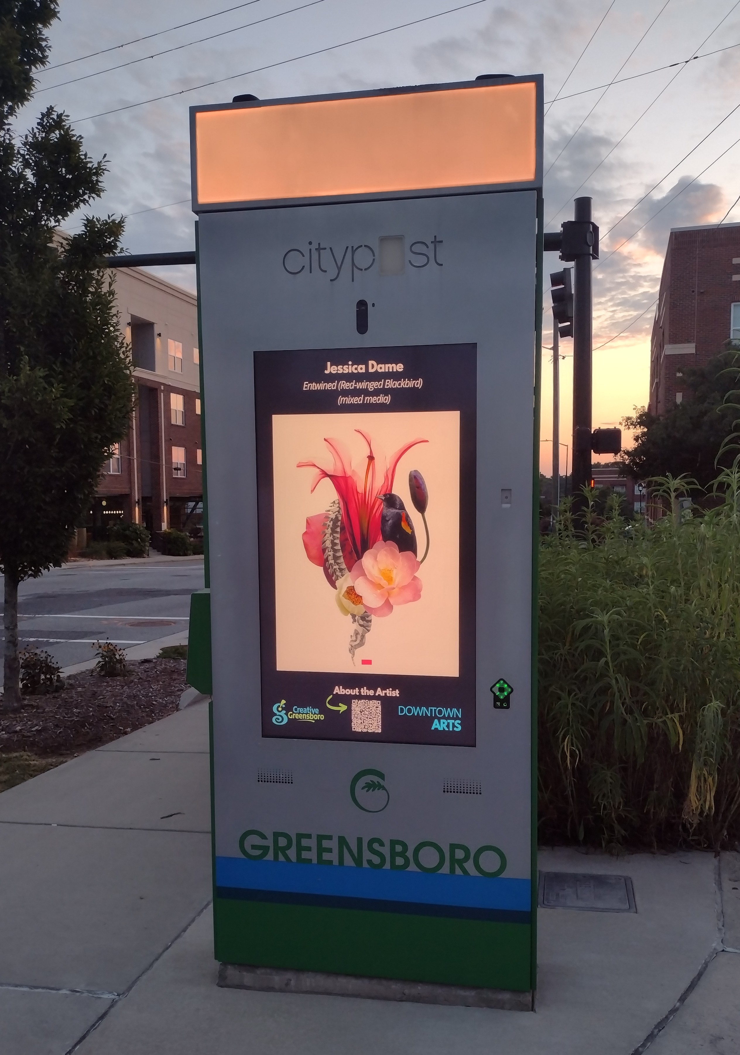 Red-Winged Blackbird was featured on kiosks across Downtown Greensboro in July and August 2023. Creative Greensboro’s Downtown Art Program supports and raises community awareness of local artists while enhancing downtown with original works of art. The program is rotating and you can find new art featured on the kiosks every ten weeks.